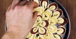 • Mettez ensuite toutes les "tortellini" dans un plat allant au four en formant le motif de votre choix (ici, une rosace). Placez ensuite un morceau de fromage sur l’anneau extérieur des "tortellini".