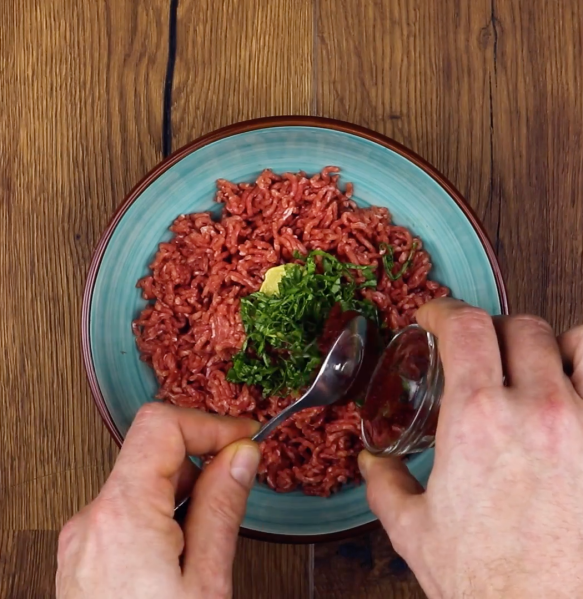 • Mettez la viande hachée dans un saladier puis ajoutez la moutarde, le basilic, le concentré de tomate, le sel et le poivre et mélangez bien.