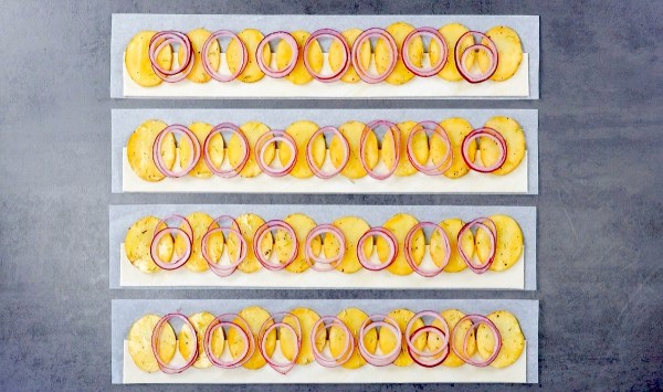 - Disposez les tranches de pommes de terre, puis les rondelles d'oignons, côte à côte et au centre des bandes de pâte feuilletée.
