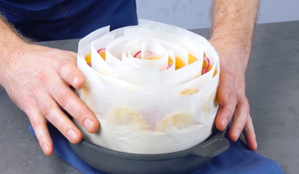 - Placez une petite assiette à l'envers dans une poêle antiadhésive. Enroulez ensuite les bandes de pâte feuilletée garnies l'une après l'autre pour former un grand escargot, puis posez-le sur l'assiette dans la poêle.