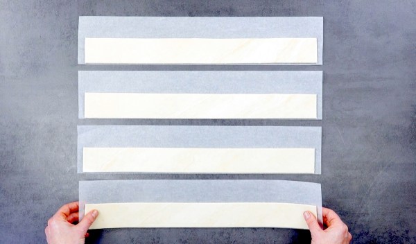- Découpez le papier sulfurisé en bandes et graissez-le des deux côtés. Découpez ensuite la pâte feuilletée en quatre bandes de même longueur (environ 6 x 35 cm) et placez une bande au milieu du bord inférieur de chaque bande de papier sulfurisé.