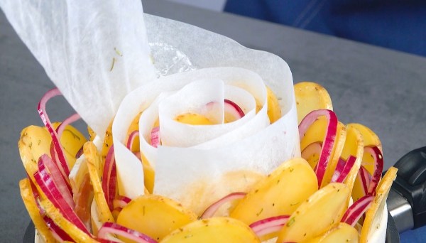 C’est aussi simple que cela de transformer des pommes de terre d’apparence ennuyeuse en une magnifique rose avec une délicieuse farce à base de brie, de bacon et d’oignons. Pour parfaire le goût, nous recommandons de l’accompagner d’une sauce à l’ail corsée ou d’une crème aigre rafraîchissante. Bon Ap’ !