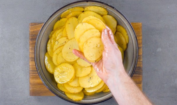 - Coupez les pommes de terre en fines tranches avec leur peau, mélangez-les avec de l'huile et du romarin et assaisonnez-les avec du sel et du poivre. Laissez ensuite reposer le mélange pendant 20 minutes.