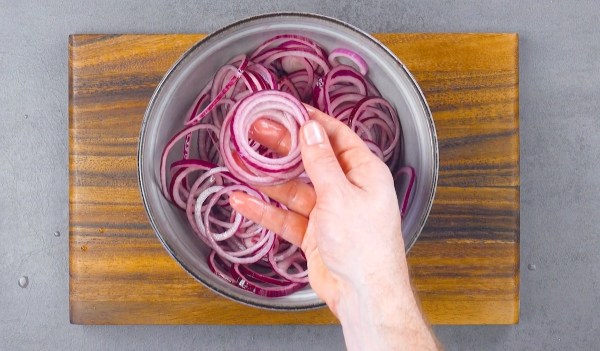 - Pendant ce temps, épluchez les oignons rouges, coupez-les en rondelles et mélangez-les avec le vinaigre balsamique. Laissez également reposer le tout pendant 20 minutes.