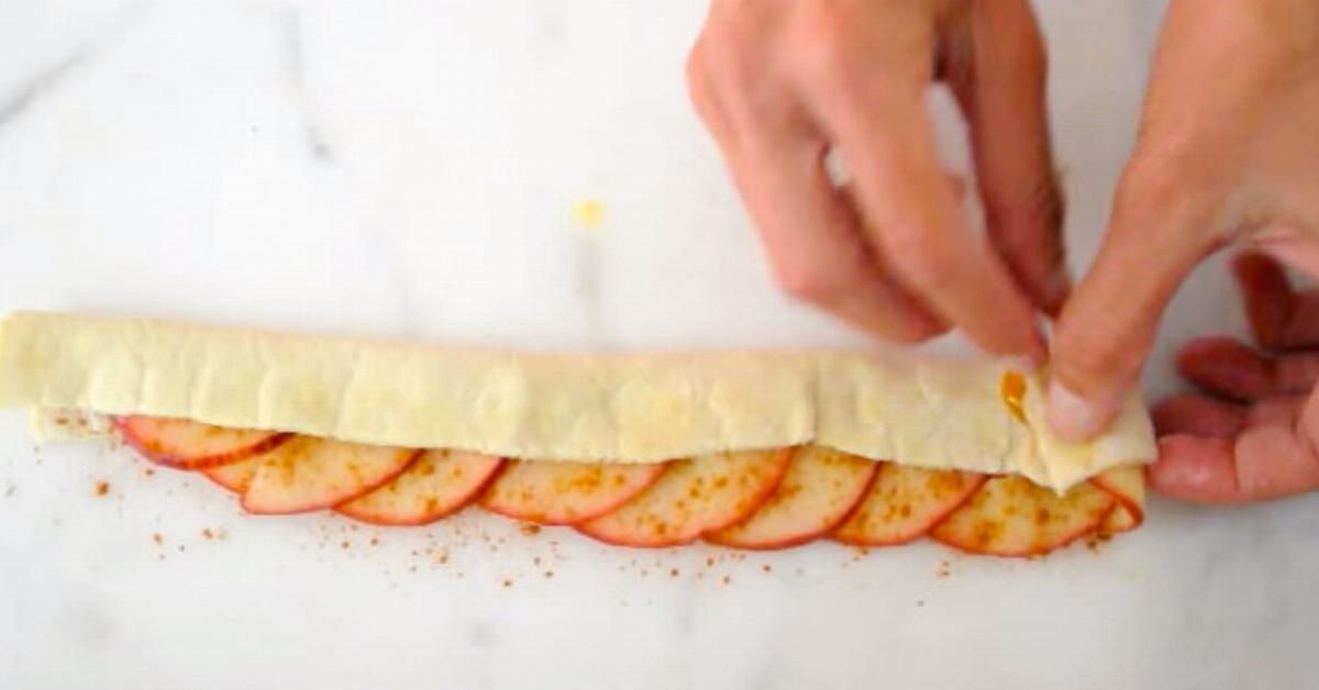 • Étalez la pâte feuilletée sur 30 cm de long et coupez-la en bandes de 6 cm de large. Enduisez la pâte avec la confiture d’abricots et placez les tranches de pomme sur la moitié supérieure. Vous pouvez également les saupoudrer de cannelle si vous voulez. Maintenant, pliez la bande en deux et enroulez-la sur elle-même.
