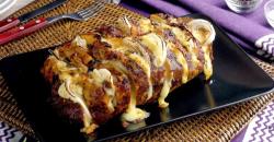 - Retirez la viande du plat et déposez-la sur une plaque à pâtisserie. Faites comme si vous vouliez le couper en tranches - mais ne faites pas les incisions jusqu'au bout. Placez les tranches des oignons restantes dans les incisions. Ajoutez ensuite une demi tranche de fromage dans chacune d'elles.
