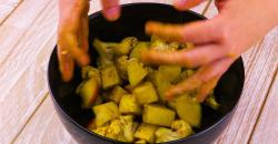 - Pour les légumes, coupez-les en morceaux et assaisonnez-les avec les épices et l'huile d'olive puis mélangez bien avec les mains. Dispersez-les tout autour du rôti.