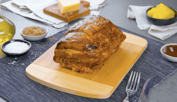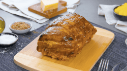 • Placez la dernière tranche de viande par-dessus. Nouez une ficelle de cuisson autour du rôti pour que le tout tienne bien en place. Badigeonnez le tout de sauce BBQ et glissez le rôti au four pendant 50 minutes à 170 °C, à chaleur tournante.