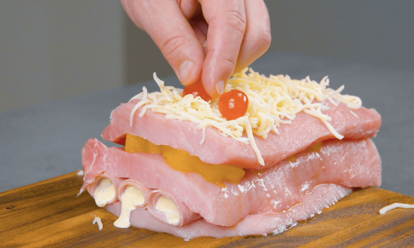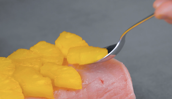 • Déposez six rouleaux de jambon sur une tranche d'échine de porc et une autre tranche par-dessus. Répartissez ensuite une couche d'ananas.
