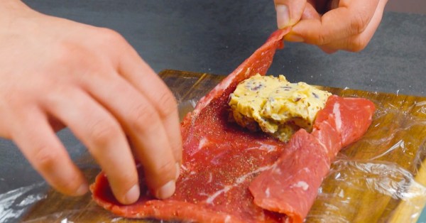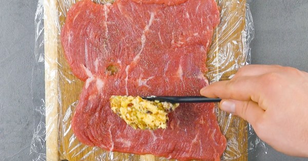 - Ouvrez la viande comme dans la vidéo et placez-la finement entre deux films alimentaires. Assaisonnez la viande avec du sel et du poivre et placez la moitié du beurre au centre de la partie inférieure de la viande.