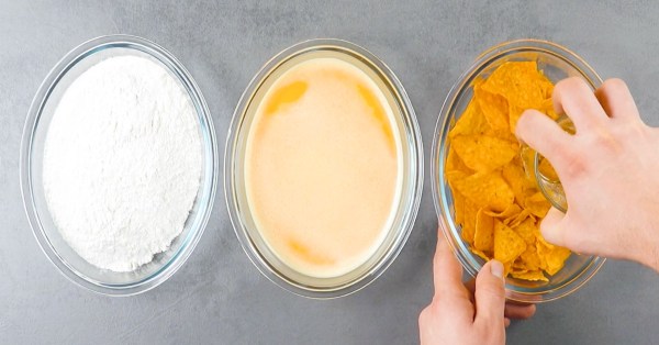 - Écrasez les chips tortillas et répartissez-les, ainsi que la farine et les œufs, dans un saladier. Trempez la roulade d'abord dans la farine, puis dans les œufs et enfin dans les chips émiettées. Pour finir, trempez la roulade encore une fois dans les œufs et les nachos.