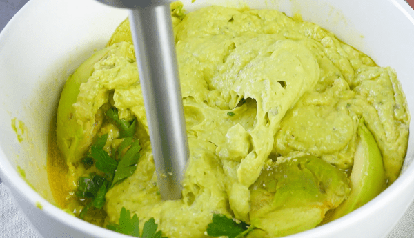 - Mettez l'avocat, l'ail, le basilic, le persil, le parmesan, le sel et le poivre, l'huile et le jus d'un citron dans un saladier et réduisez le tout en purée à l'aide d'un mixeur jusqu'à obtenir une masse crémeuse.