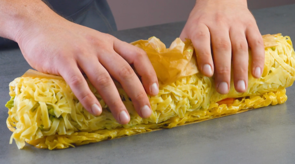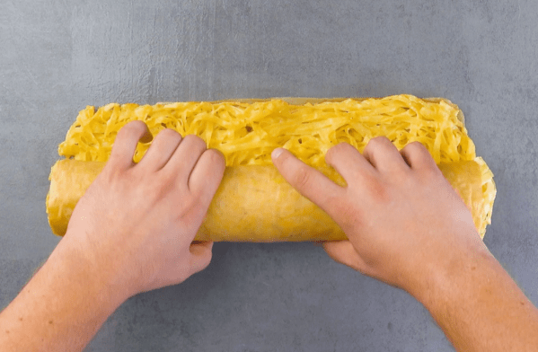 - Enfournez la plaque à 200 °C pendant 10 minutes. Formez un rouleau avec les tagliatelles encore chaudes et laissez refroidir.