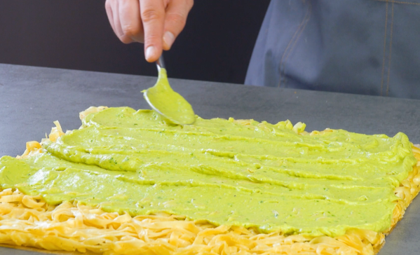 - Déroulez le rouleau de pâtes et répartissez la crème d'avocat dessus. Laissez un bord d'environ 4-5 cm libre.