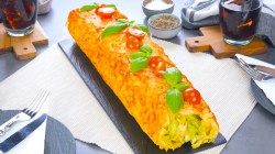 - Recouvrez le roulé entièrement de sauce tomate et décorez le tout avec du basilic frais et des tomates cerises.