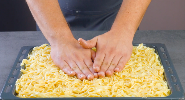 - Faites cuire les pâtes et laissez-les refroidir. Incorporez ensuite les œufs et le parmesan et assaisonnez le tout de poivre. Répartissez les tagliatelles sur une plaque de cuisson recouverte de papier sulfurisé et aplatissez-les avec les mains légèrement humides.