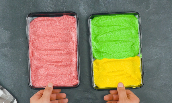 • Recouvrez deux plaques à pâtisserie de papier sulfurisé, déposez la pâte rouge sur une plaque et lissez-la. La pâte verte et la pâte jaune se partagent l'autre plaque (il faut un peu plus de pâte verte). Lissez également la pâte et faites-la cuire pendant 15 minutes au four à 140 °C, en mode convection.