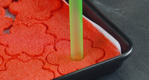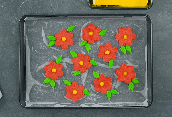 • Sortez les pâtes du four et laissez-les refroidir. Découpez les fleurs dans la pâte rouge à l'aide d'un emporte-pièce. Ensuite, formez un cercle avec une paille au milieu de la fleur.