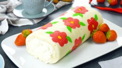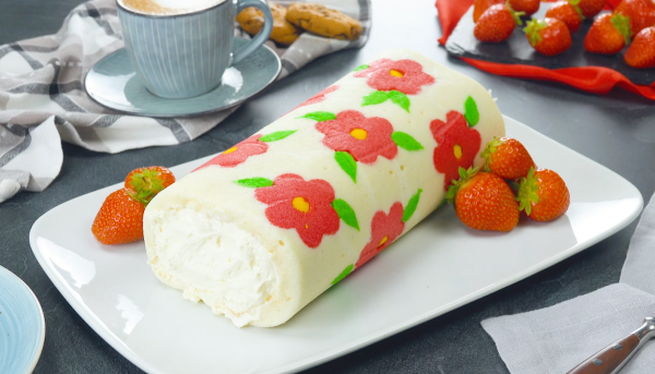 Roulé de génoise au cœur crémeux à la fraise et aux motifs floraux