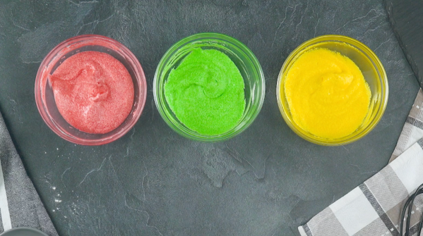 • Battez les blancs d'œufs avec le sucre jusqu'à ce qu'ils forment une mousse et ajoutez la graisse de coco et la farine. Répartissez la pâte dans trois petits saladiers (50 %, 25 % et 25 %) et colorez la pâte avec du colorant alimentaire rouge, vert et jaune (dans cet ordre).