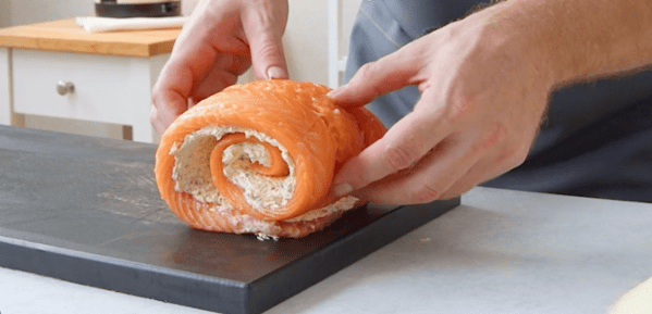 - Essuyez le filet de saumon et retournez la face inférieure vers le haut. Enduisez le poisson de beurre aux herbes et enroulez-le.