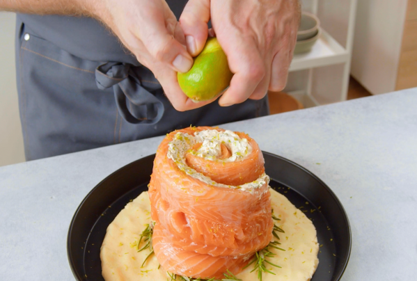 - Posez maintenant le roulé de saumon dessus. Râpez le zeste du citron vert et pressez le jus. Répartissez-les ensuite sur le roulé de saumon.