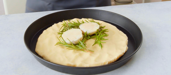 - Appuyez sur 1/3 de la croûte de sel sur un plat à tarte et couvrez le centre avec du romarin et les gousses d'ail coupées en deux.