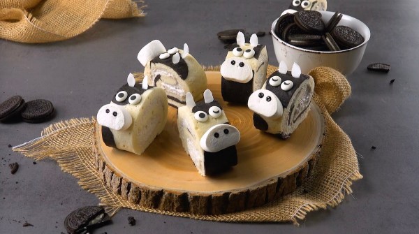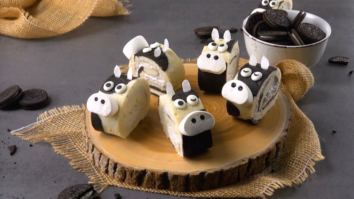 - Coupez le roulé en morceaux et décorez avec des flocons de noix de coco, des yeux en sucre et des guimauves pour qu'ils ressemblent à de petites vaches.