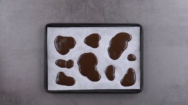 - Montez les blancs d'œufs en neige avec le sucre puis ajoutez l'huile de noix de coco et le mélange foncé en remuant. Étalez la pâte en taches sur une plaque à pâtisserie recouverte de papier sulfurisé. Conseil : placez ensuite la plaque pendant 10 minutes au congélateur.