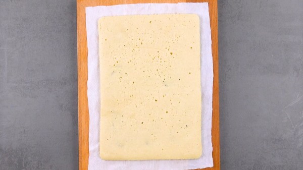 - Posez délicatement le gâteau sur un torchon humide et retirez le papier sulfurisé. Recouvrez-le d'un torchon humide et retournez-le de façon à ce que la pâte claire soit orientée vers le haut. Laissez refroidir complètement le gâteau.