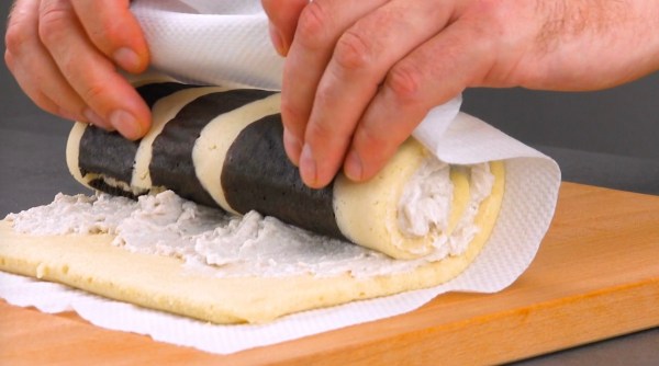 - Enroulez la pâte à l'aide du torchon et mettez le roulé au réfrigérateur pendant 1 heure.