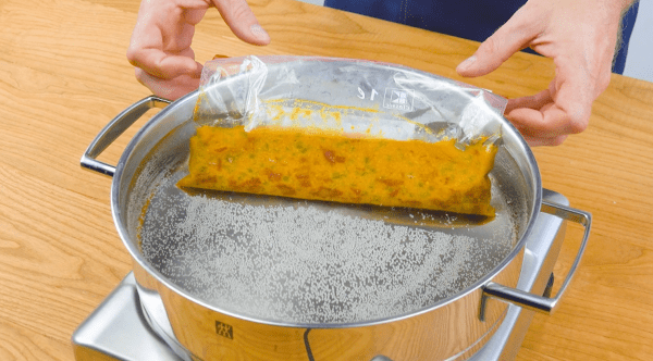 - Ajoutez le poivron, les morceaux de salami, le cheddar râpé, le sel et le poivre aux jaunes d'œufs et mélangez le tout. Graissez un sachet de congélation et remplissez-le avec le mélange. Placez le sac dans l'eau à environ 85 °C et faites-le cuire pendant environ 90 minutes. Ensuite, sortez les jaunes du sac et laissez-les refroidir pendant environ 20 minutes.