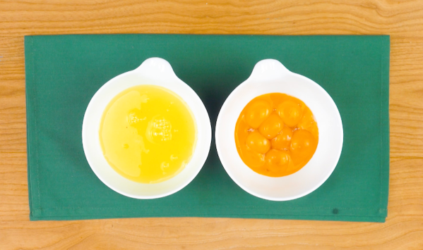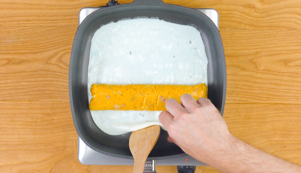 - Mettez une partie du blanc d'œuf dans une poêle graissée et faites cuire à feu doux. Placez le jaune d'œuf cuit sur le dessus et roulez-le soigneusement dans le blanc cuit.