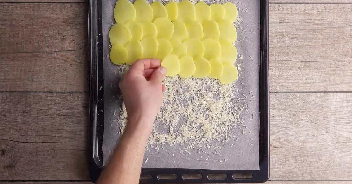 - Étalez la moitié du parmesan sur une plaque à pâtisserie recouverte de papier sulfurisé. Placez les tranches de pommes de terre en rangées (se chevauchant légèrement) sur le fromage. Salez les pommes de terre et saupoudrez le reste de parmesan. Enfournez les pommes de terre à 180 °C pendant 30 minutes.