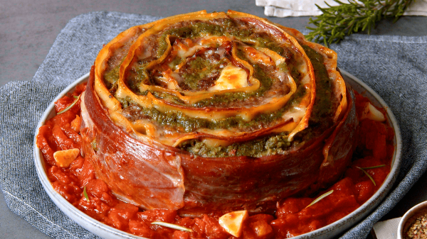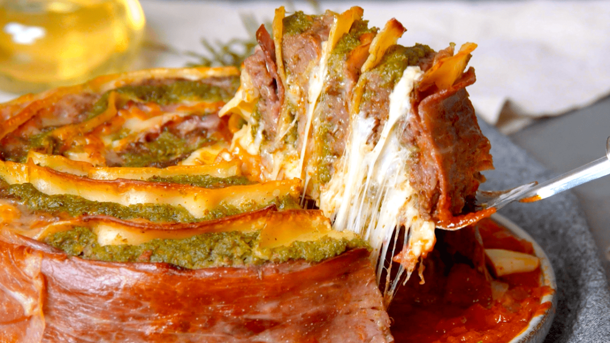 Bien que savoureux, on connait tous le pain de viande qui n’a rien d’original. Place désormais au rouleau de viande hachée géant ! Cette recette avec du jambon de Parme, du pesto au basilic, des feuilles de lasagne et de la sauce tomate fait concurrence à toutes les recettes de viande hachée que vous connaissiez précédemment ! Aux fourneaux !