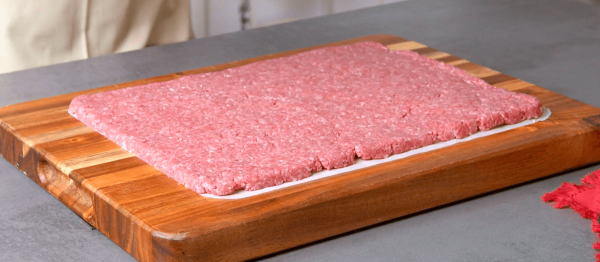 - Appuyez sur le bœuf haché de façon uniforme sur la plaque de cuisson préalablement graissée. Couvrez-le de papier sulfurisé et retournez-le pour qu'il repose sur le papier.