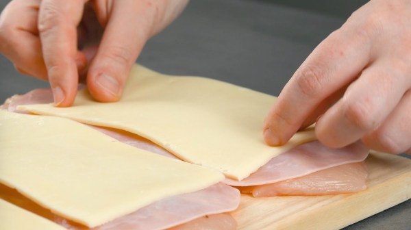 - Ouvrez les blancs de poulet en deux et aplatissez-les. Assaisonnez ensuite la viande avec du sel et du poivre et recouvrez-la de jambon et de fromage.