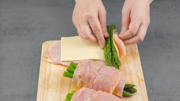- Blanchissez les asperges et déposez cinq tiges sur chaque blanc de poulet. Enroulez les blancs de poulet sur eux-mêmes avec la garniture ; fixez les rouleaux avec des cure-dents si nécessaire.