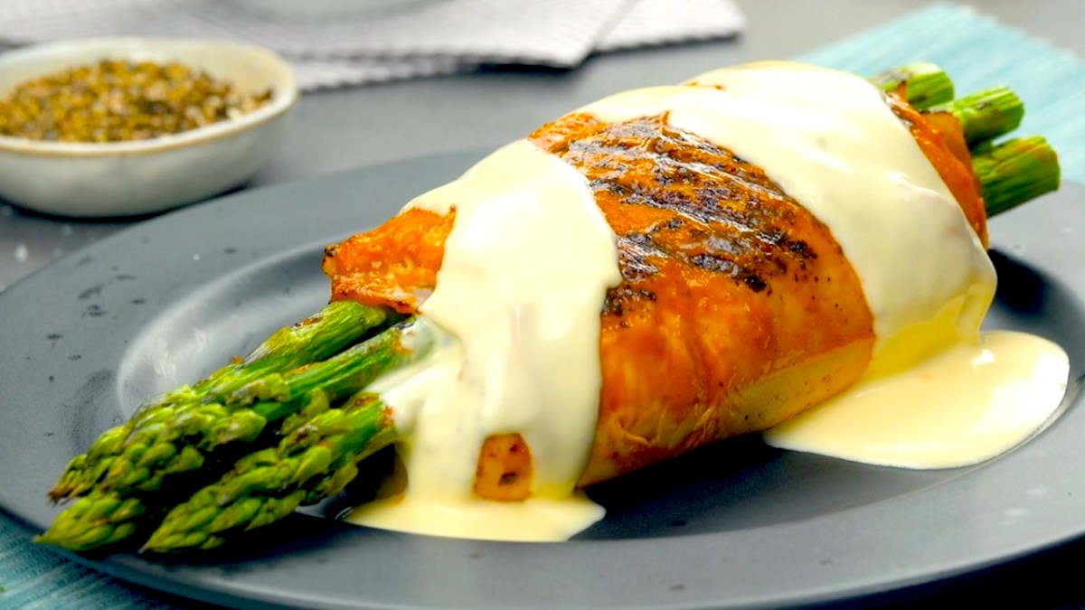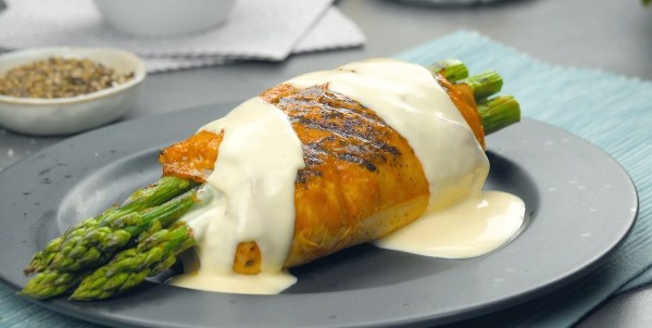 - Faites griller les roulés de poulet des deux côtés jusqu'à ce qu'ils soient dorés et croustillants, et servez avec la sauce hollandaise.