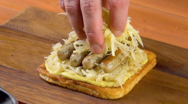 - Lorsque les saucisses sont dorées, vous pouvez commencer à garnir les tranches de pain de mie grillé. La première couche : 1 cuillère à café de moutarde. Mettez ensuite une poignée de choucroute sur la moutarde puis 4 saucisses. Enfin, saupoudrez le tout de fromage suisse râpé. Reproduisez ça avec les autres tranches de pain de mie puis enfournez à 160 °C pendant 20 minutes à chaleur tournante.