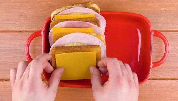 - Retirez les tranches de pain de mie grillé de la poêle et garnissez-les : d'abord d'une tranche de cheddar puis d'une tranche de jambon, d'une tranche d'ananas et enfin d'une autre tranche de cheddar. Placez le tout dans un plat et faites de même avec les autres tranches de pain de mie grillé. Enfournez pendant 20 minutes à 160 °C à chaleur tournante.