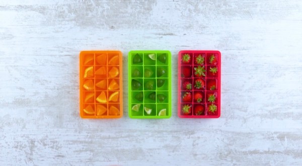 - Coupez le reste des oranges et des citrons verts en morceaux. Mettez les morceaux d'orange et de citron vert ainsi que de fraise dans chaque compartiment d'un bac à glaçons. Versez de l'eau sur les fruits et congelez.