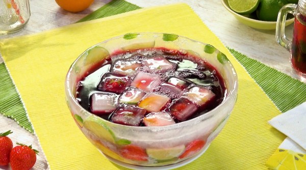 - Mélangez le vin rouge avec la citronnade, la liqueur d'orange et le sucre. Sortez ensuite le saladier glacé du congélateur, retirez les deux saladiers en verre, ajoutez les glaçons et versez la sangria.