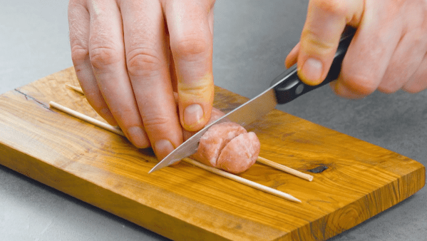 - Placez deux brochettes en bois sur les côtés de la saucisse. Entaillez ensuite la saucisse avec un couteau tranchant à intervalles réguliers (ne la coupez pas complètement).Remplissez les entailles de la saucisse avec du fromage, des poivrons et de l'oignon.Plantez une brochette en bois dans la saucisse et faites-la frire de tous les côtés dans une poêle.