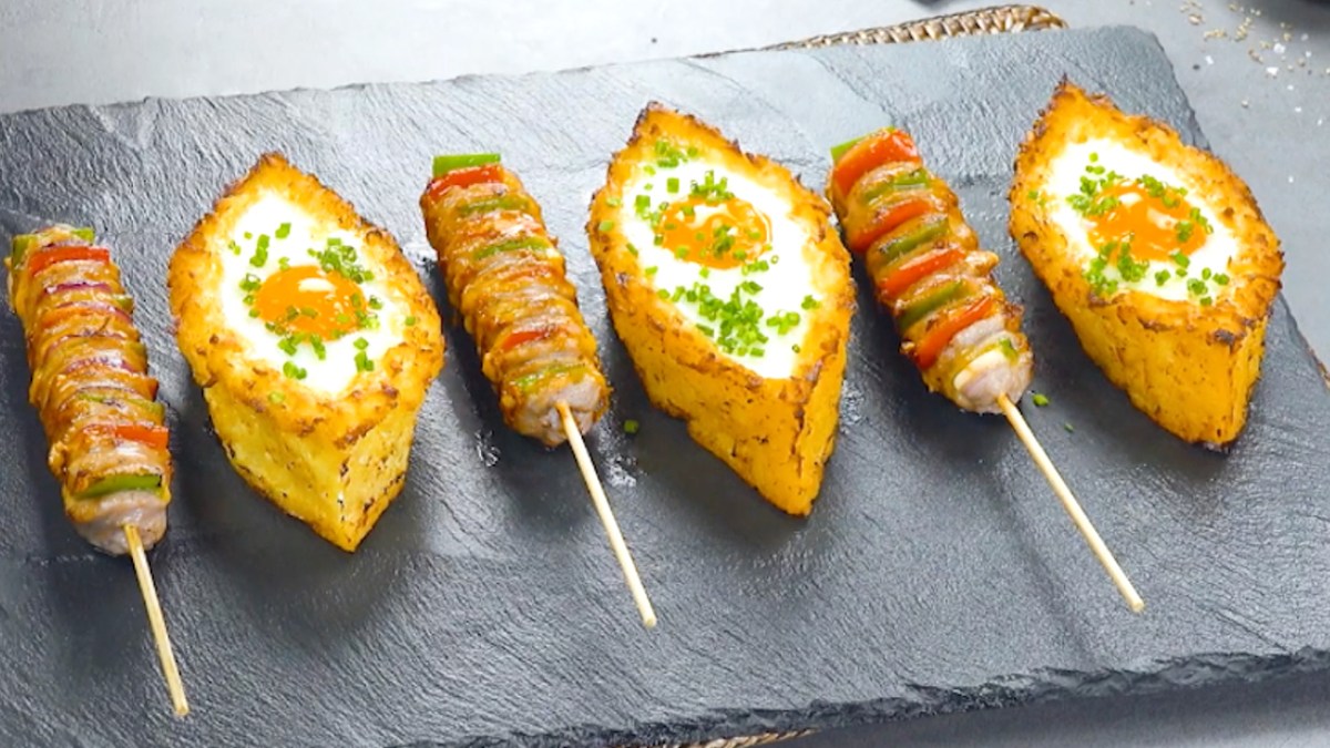 Le terme “Hasselback” n’est forcément familier pour ceux qui ne connaissent pas la cuisine suédoise. Il s’agit d’une façon populaire de préparer les pommes de terre en les coupant à intervalles réguliers et en les enduisant de beurre. Cette technique de découpe particulière peut également être utilisée pour d’autres aliments. Par exemple, pour les saucisses. Aujourd’hui, nous préparons une saucisse façon Hasselback sur un bâtonnet, garnie de poivrons, de fromage et d’oignons. Nous la servons avec des barquettes de pommes de terre très savoureuses qui contiennent un œuf au plat.