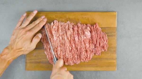 • Ajoutez le mélange d'épices, la poudre d'oignon et l'ail à la viande et mélangez bien le tout. Ensuite, formez une saucisse avec une poignée de viande de porc assaisonnée et enroulez-la dans du film alimentaire, en scellant les extrémités avec des ficelles.