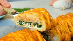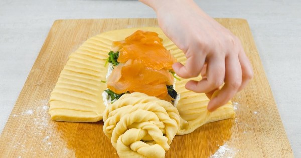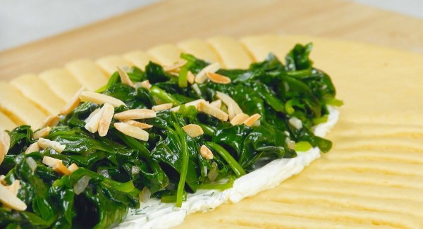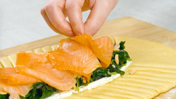 Lorsque la délicieuse garniture au saumon fumé, aux épinards, au fromage frais et aux amandes se révèle, tous vos invités resteront bouche bée devant un tel chef d’œuvre ! Bon Ap’ !