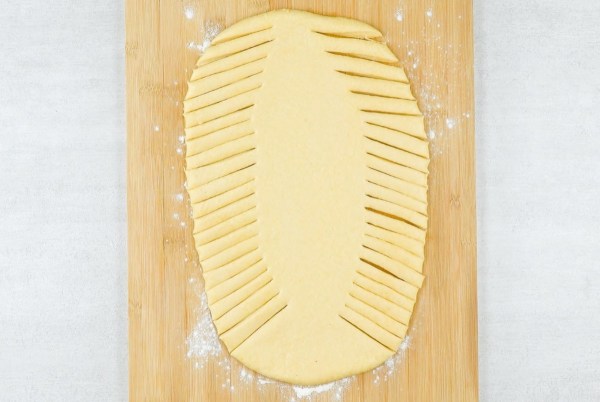 - Étalez la pâte en une forme ovale sur une surface enfarinée et coupez-la en diagonale sur les côtés, mais laissez une bordure au bout.
