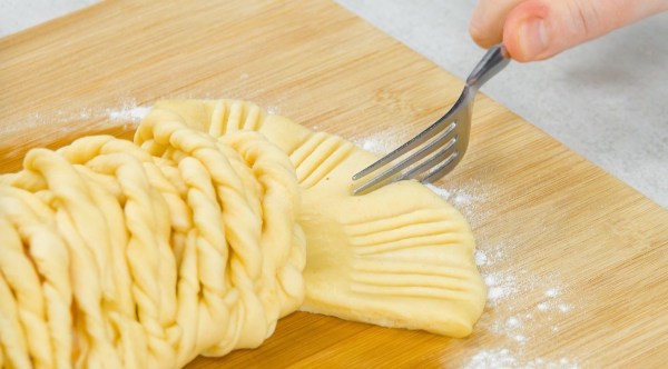 - Décorez le bord de la pâte qui n'a pas encore été découpé à l'aide d'une fourchette pour lui donner la forme d'une nageoire de poisson.