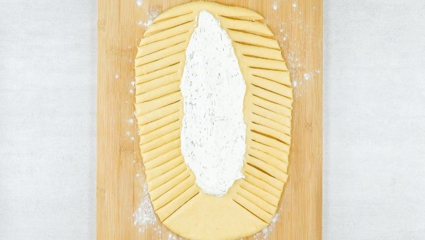 - Étalez d'abord le fromage frais au milieu de la pâte.